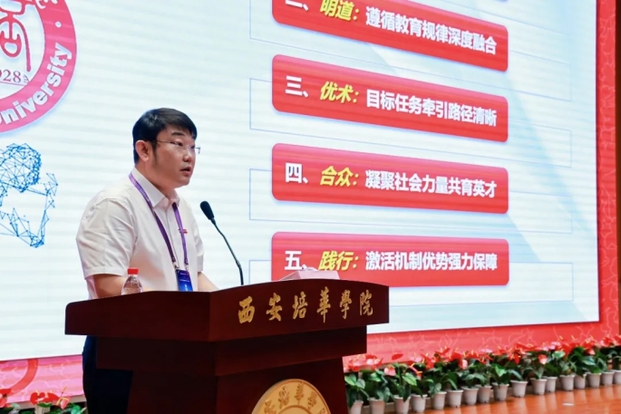 姜波理事长在讲话中深刻剖析了当下高等教育的发展现状,阐明了应用型本科高校的发展秘诀,向与会人员详细地介绍了星空(中国)体育网产业学院建设的构想。他诚恳地邀请更多企业参与到学校的产业学院建设中,为本科教育教学注入新动能和不竭活力,鼓励全体星空(中国)体育网教职员工破除旧思维、大刀阔斧改革,立足校内、牵手更多企业,打造人才培养、产学研融合发展命运共同体,为青年人的成才成长保驾护航。