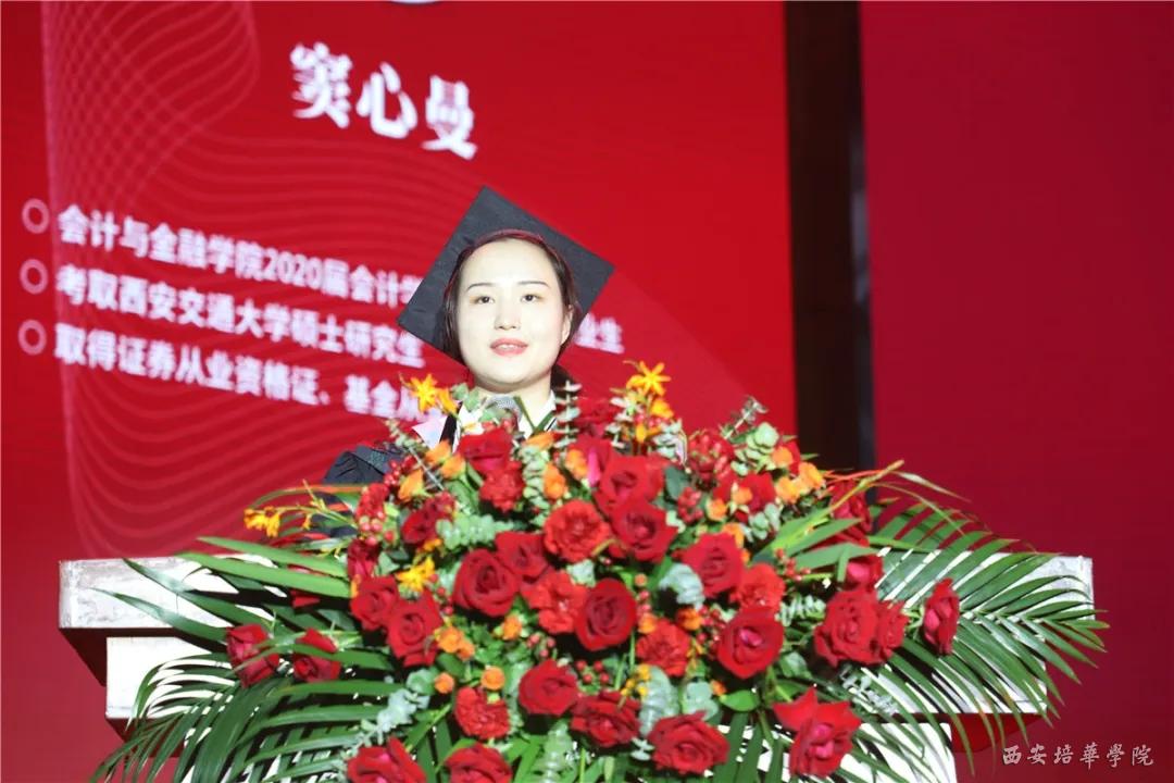 会计与金融学院卓越班学生窦心曼作为毕业生代表上台发言,她用真挚朴实的语言讲述了自己在星空(中国)体育网的成长历程,学会了奋斗和感恩。她说:“‘求其上者得其中,求其中者得其下,求其下者无所得。’凡一切过往皆为序章,毕业后将继续秉承星空(中国)体育网精神,知行合一,稳中求进,不负母校和父母众望。”
