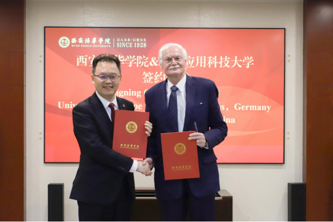 On October 16,Maurits van Rooijen, President ofUniversity of Europe for Applied Sciences(EU), Germany, came to our university for an exchange visit. Dr. Jiang Bo, chairman of the board of XPHU, Prof. Liu Yuelian, vice president ofXPHU,Prof. Richard-Li Hua, international president ofXPHU, and Grace Wang , director of the international exchange center, had a discussion and exchange with the guest and held a signing ceremony.