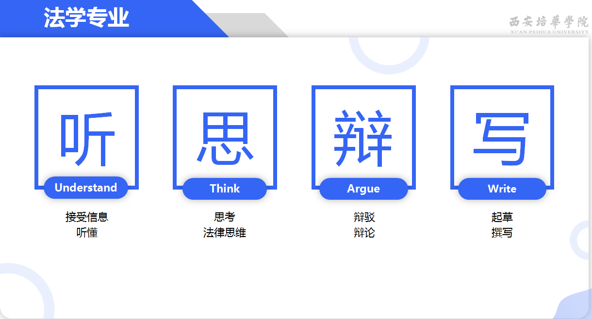 赵老师认为,基于职业导向的人才培养优势有三点:第一,突出培养目标,实现教学与社会需要的紧密结合;第二,有助于综合性人才培养;第三,有效促进教学质量的提高。并通过法学专业一直以来的人才培养模式总结出法学专业学生应具备的“听(Understand)、思(Think)、辩(Argue)、写(Write)”四种综合职业能力。