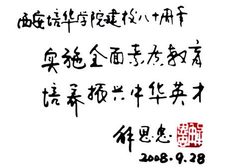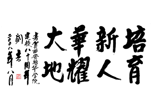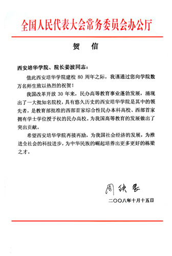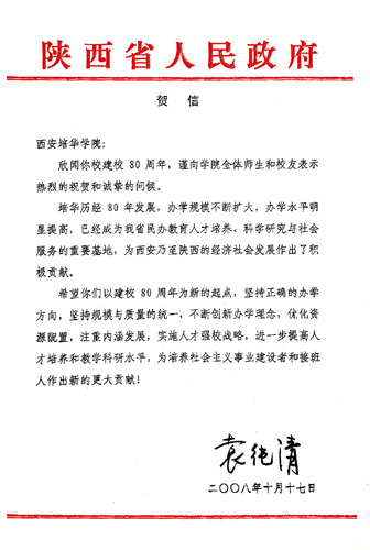 为庆典大会发来贺信及题词的领导有:全国人大常委副委员长、民革中央主席周铁农;全国政协副主席、农工民主党中央常务副主席陈宗兴;全国妇联主席、第十届全国人大副委员长、中国关工委主任顾秀莲;教育部常务副部长袁贵仁;国务院稽查特派员、中华教育艺术研究会理事长刘吉;国务院国资委国有资产监事会主席、北大国民素质研究中心主任解思忠;中国关工委副主任杨志梅;全国人大法制委副主任万绍芬;中国关工委执行主任、原中组部常务副部长王照华;原国家教委副主任、全国人大科教文卫委员会原副主任杨海波;原司法部部长邹瑜;原民政部部长崔乃夫;中国教育基金会理事长、原教育部常务副部长张保庆;中华国际民营企业促进会会长、原国家工商总局副局长、原国家工商行政管理局局经济检查司司长牛鸿瑞;中科院原副院长、中科院院士 2007国家科学技术获奖得者李振声;中国工程院院士孙九林;中华国际品牌协会会长、原中国质量管理协会理事长解艾兰;著名教育家、国学大师、演讲家、中华教育研究会常务副理事长李燕杰;陕西省省长袁纯清;陕西省委副书记、教工委书记王侠;原中共陕西省委书记张勃兴;原陕西省省长程安东;原陕西省政协副主席范明;日本执政党—公明党党首大田昭宏,日本政府内阁建设大臣国土厅长官中山正晖;日本创价学会名誉会长池田大作,京都市立艺术大学校长潮江宏三等。