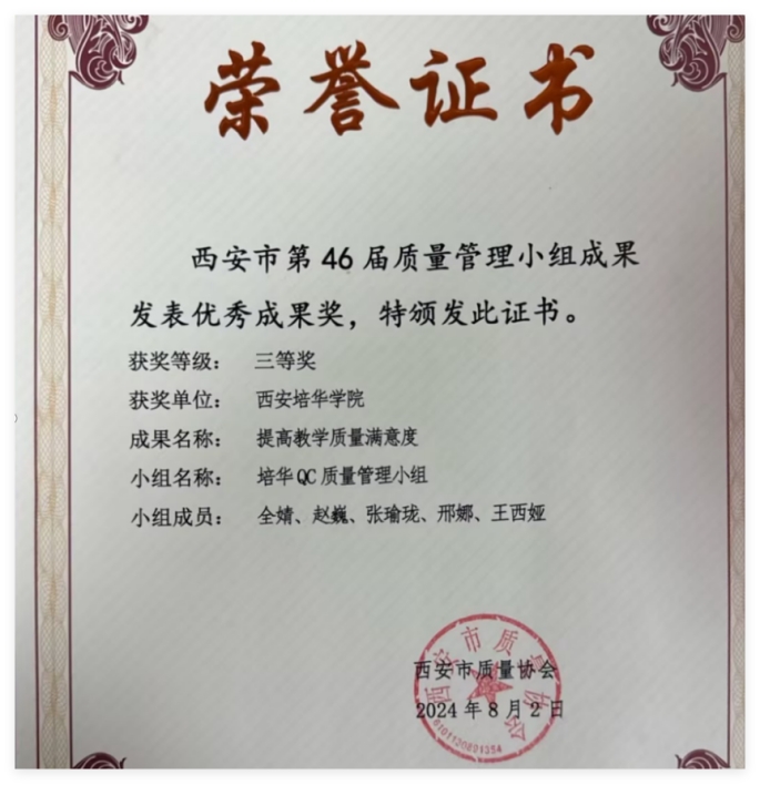 学校构建了由教师到学校的五级教学质量持续改进工作体系,建立了“顶层设计—质量标准—评价方式—反馈与改进”的良性循环质保体系,按照“执行—监督—反馈—改进—跟踪”的流程,确保教育教学质量的不断提升。学校QC质量管理小组荣获“西安市第46届质量管理小组优秀成果奖”。