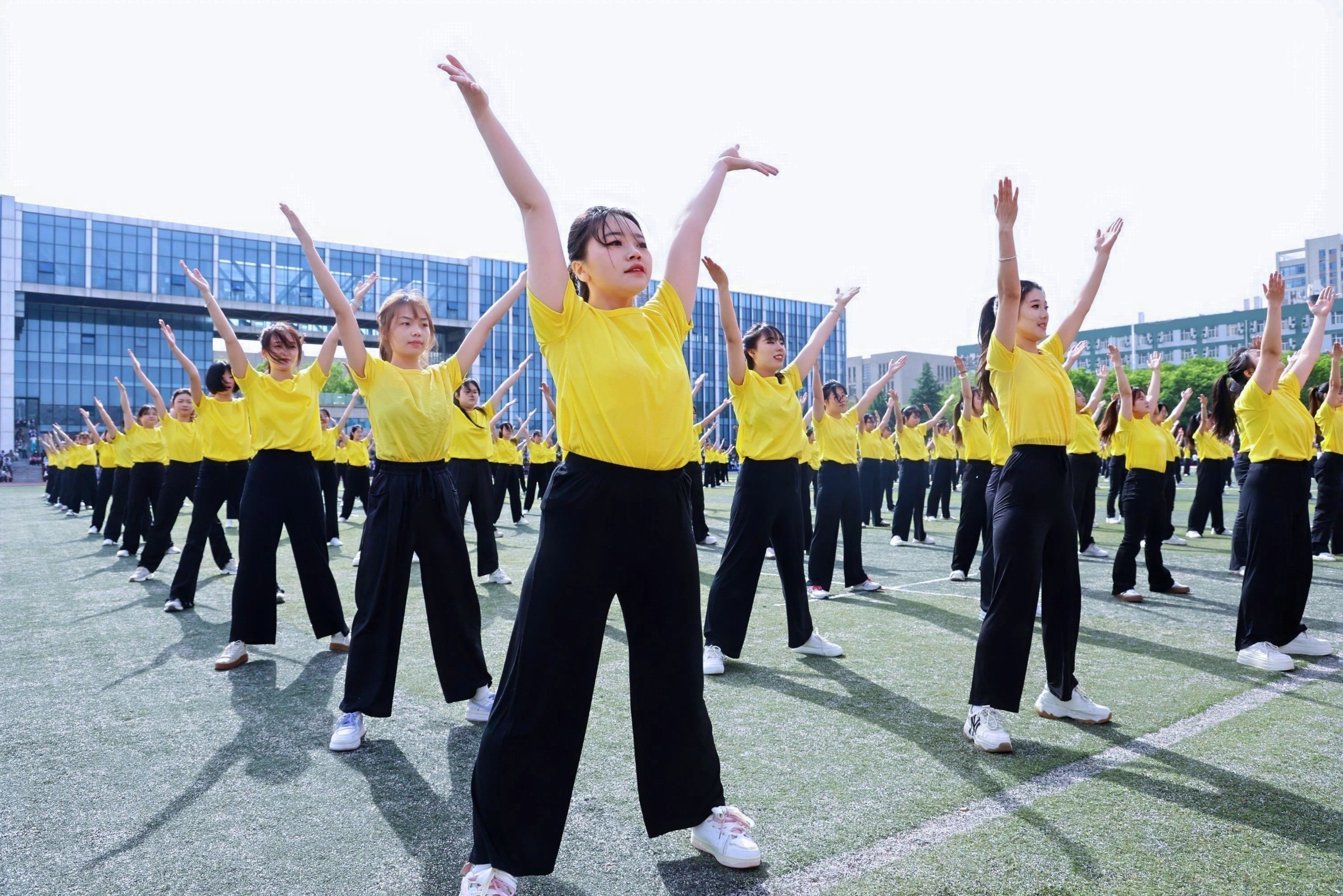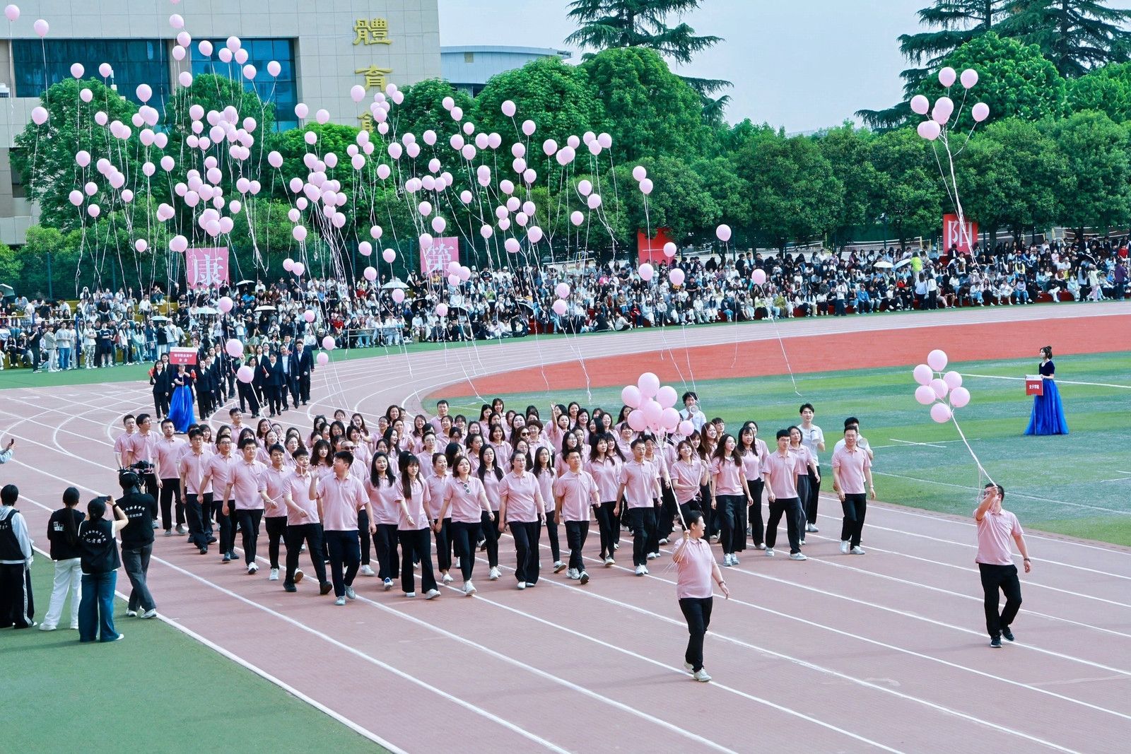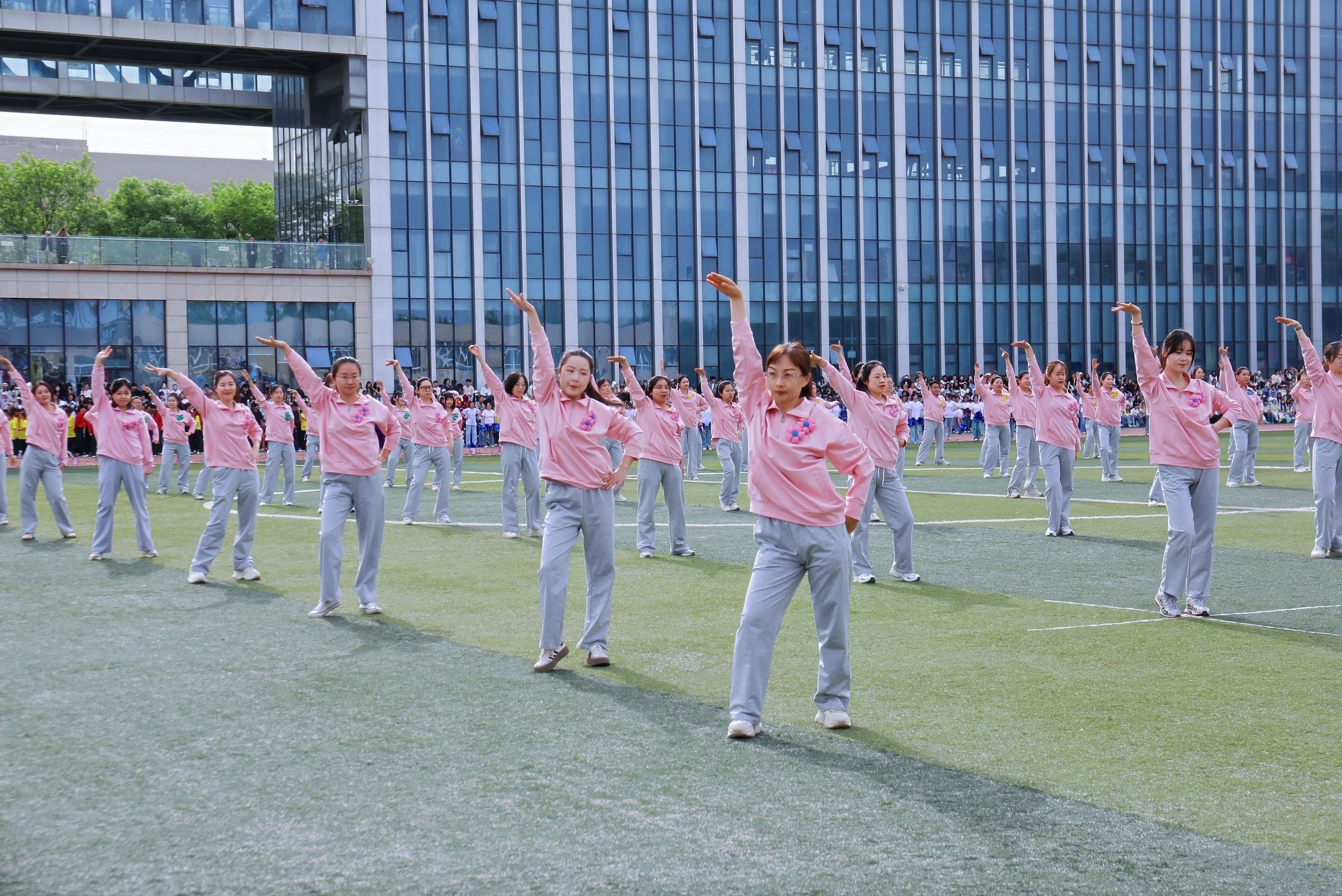 教职工方队化身粉色浪潮,144双手共绘樱花海,老师们秒变追风舞者,团队协作默契满分,欢笑与汗水交织成最萌年龄差表演。