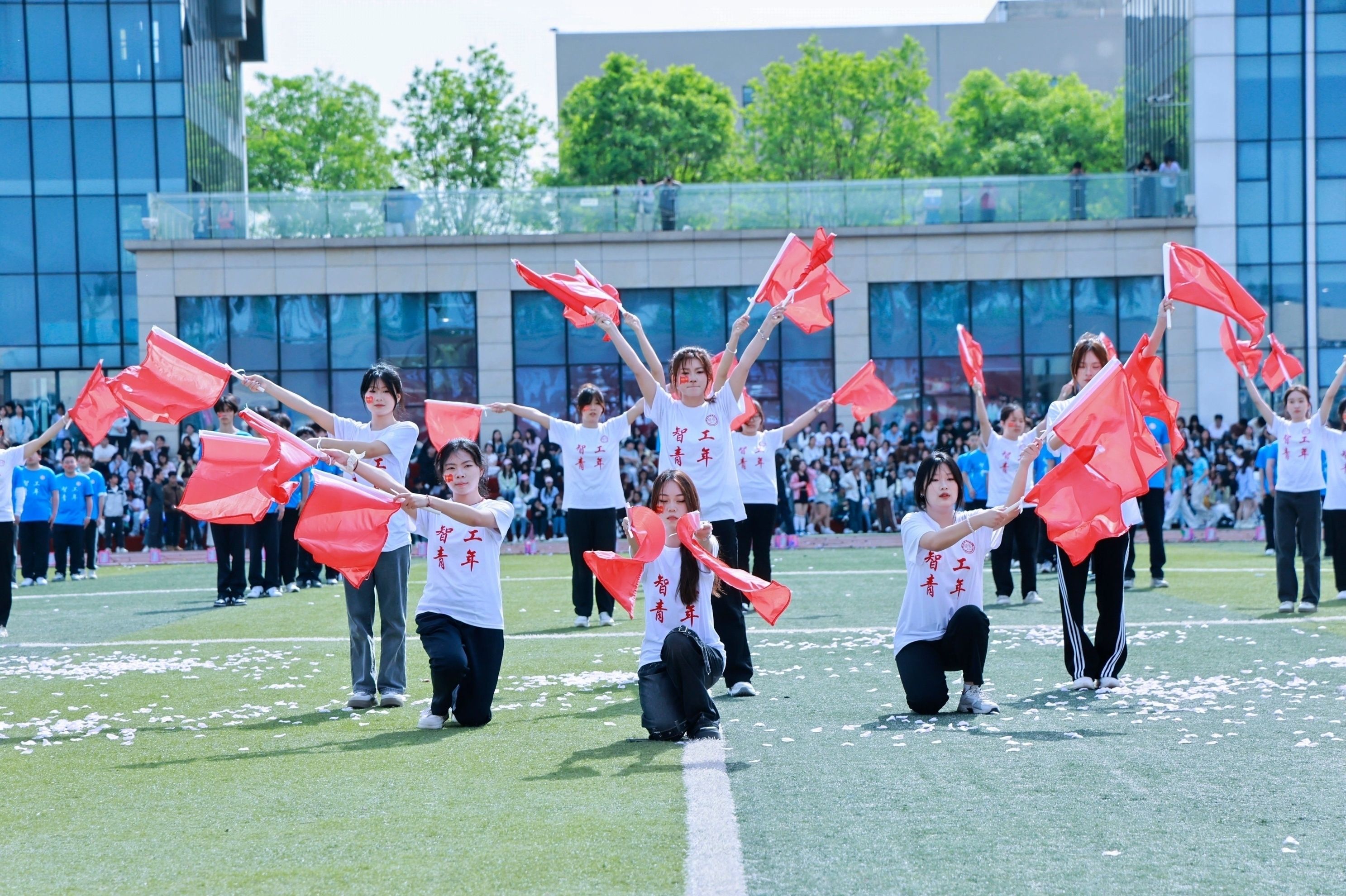 智能科学与工程学院学子执旗为剑,以钢铁之躯演绎精忠报国,红旗漫卷似燃烧的二进制烈焰。