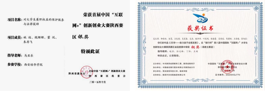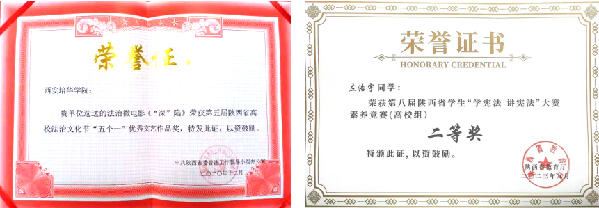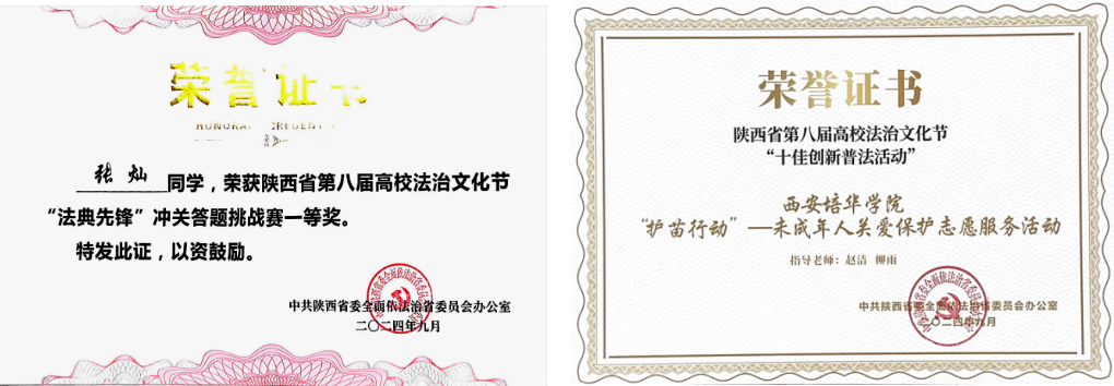 法学专业以实绩彰显省级“一流专业”建设成效:在历年的国家统一法律职业资格考试中,学生的通过率表现优异,2024年共187名学生参加考试,其中65名学生顺利通过,通过率达34.8%,同比增长了9%。在各类法律实践活动和学科竞赛中,学生也屡获佳绩,如在“互联网+”创新创业大赛中获得省赛银奖1项,铜奖3项;在陕西省高校法治文化节“五个一”活动中获得“一个法治小品”“一部法治微电影”“一首法治歌曲”和“十佳创新普法活动”“法典先锋”冲关答题挑战赛一等奖等多项奖励;在陕西省学生“学宪法讲宪法”大赛素养竞赛(高校组)二等奖等。