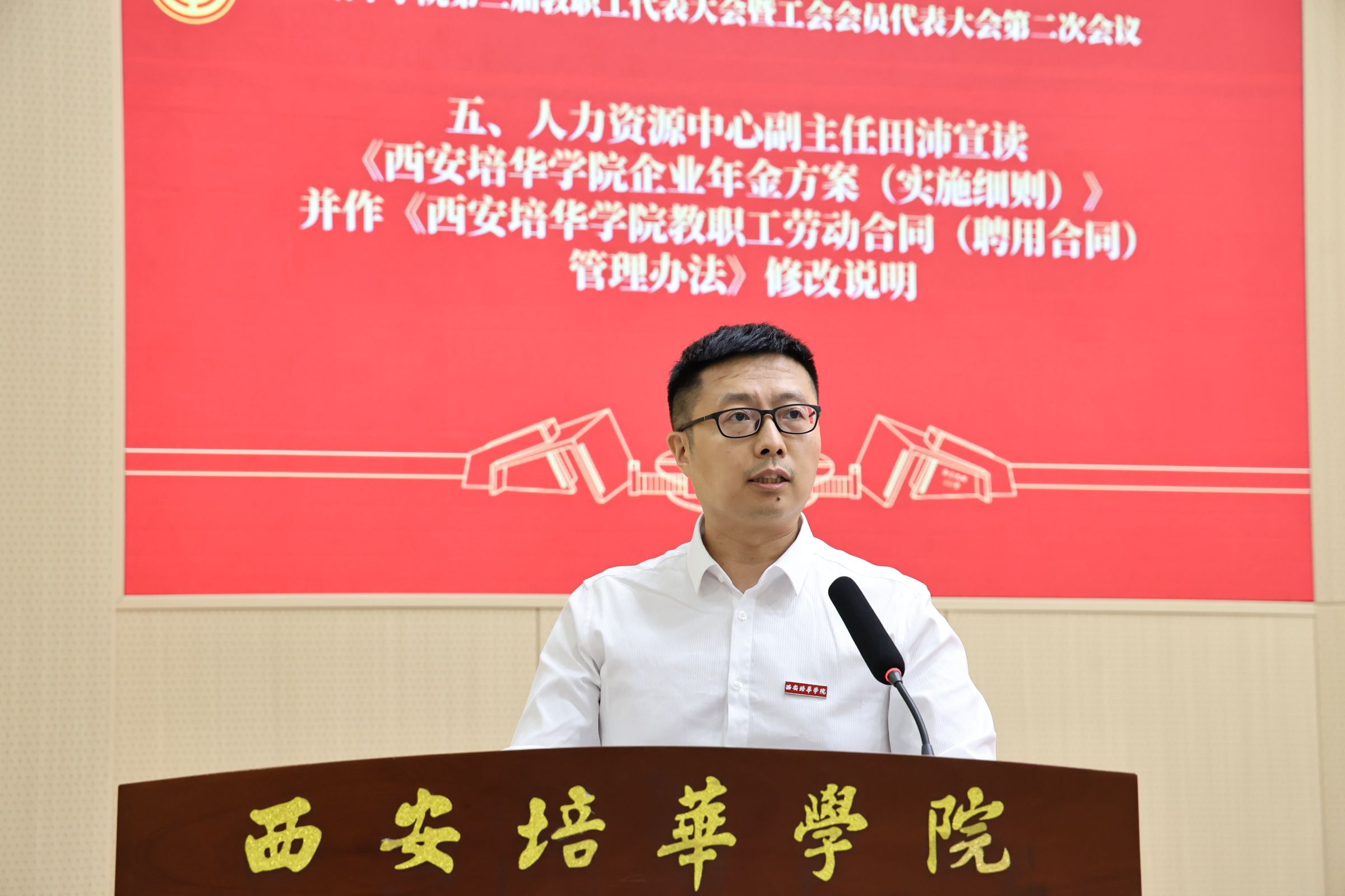 人力资源中心副主任田沛宣读《星空·官方站网页版企业年金方案(实施细则)》并作《星空·官方站网页版教职工劳动合同(聘用合同)管理办法》修改说明