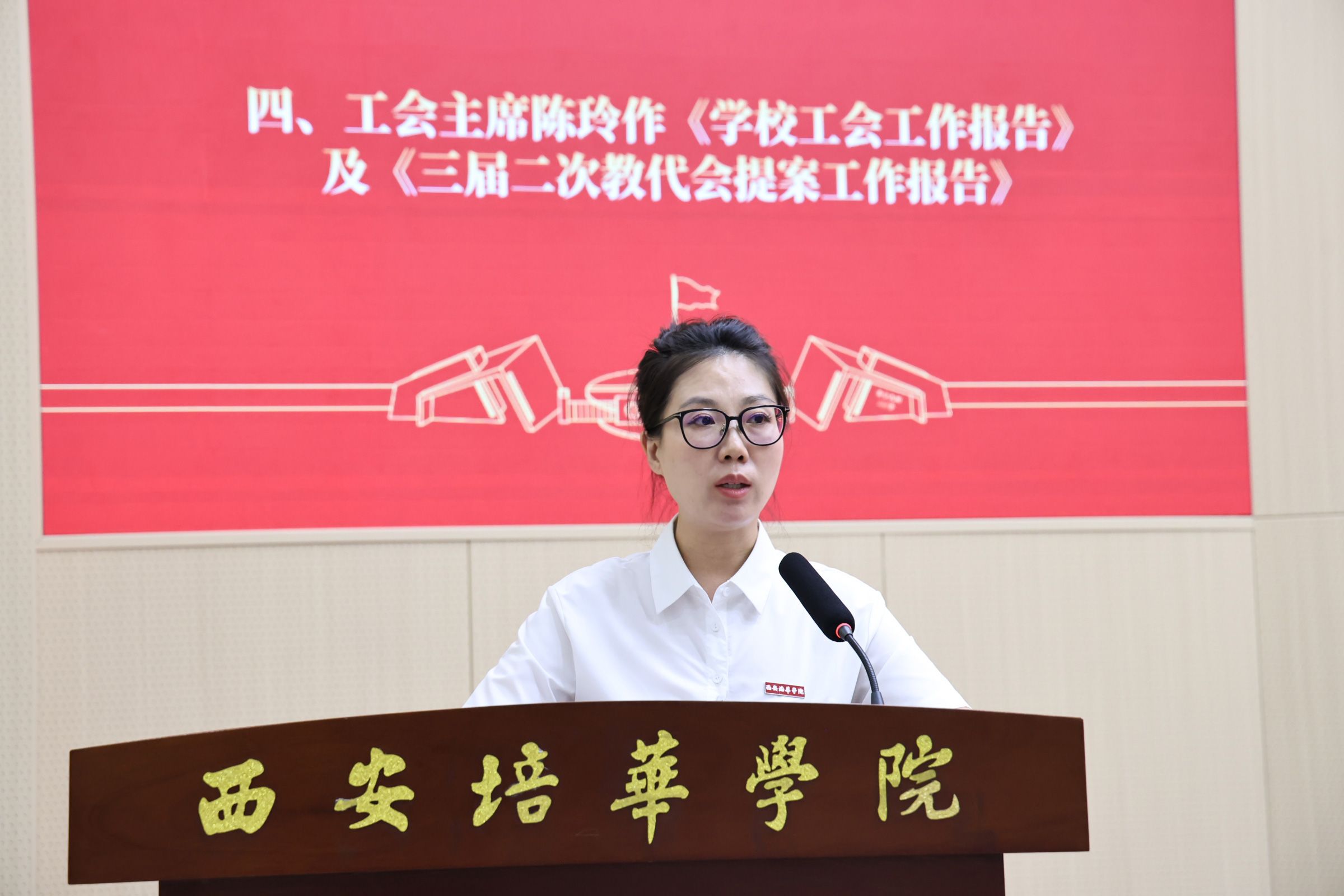 校工会主席陈玲向大会作了《学校工会工作报告》及《三届二次教代会提案工作报告》