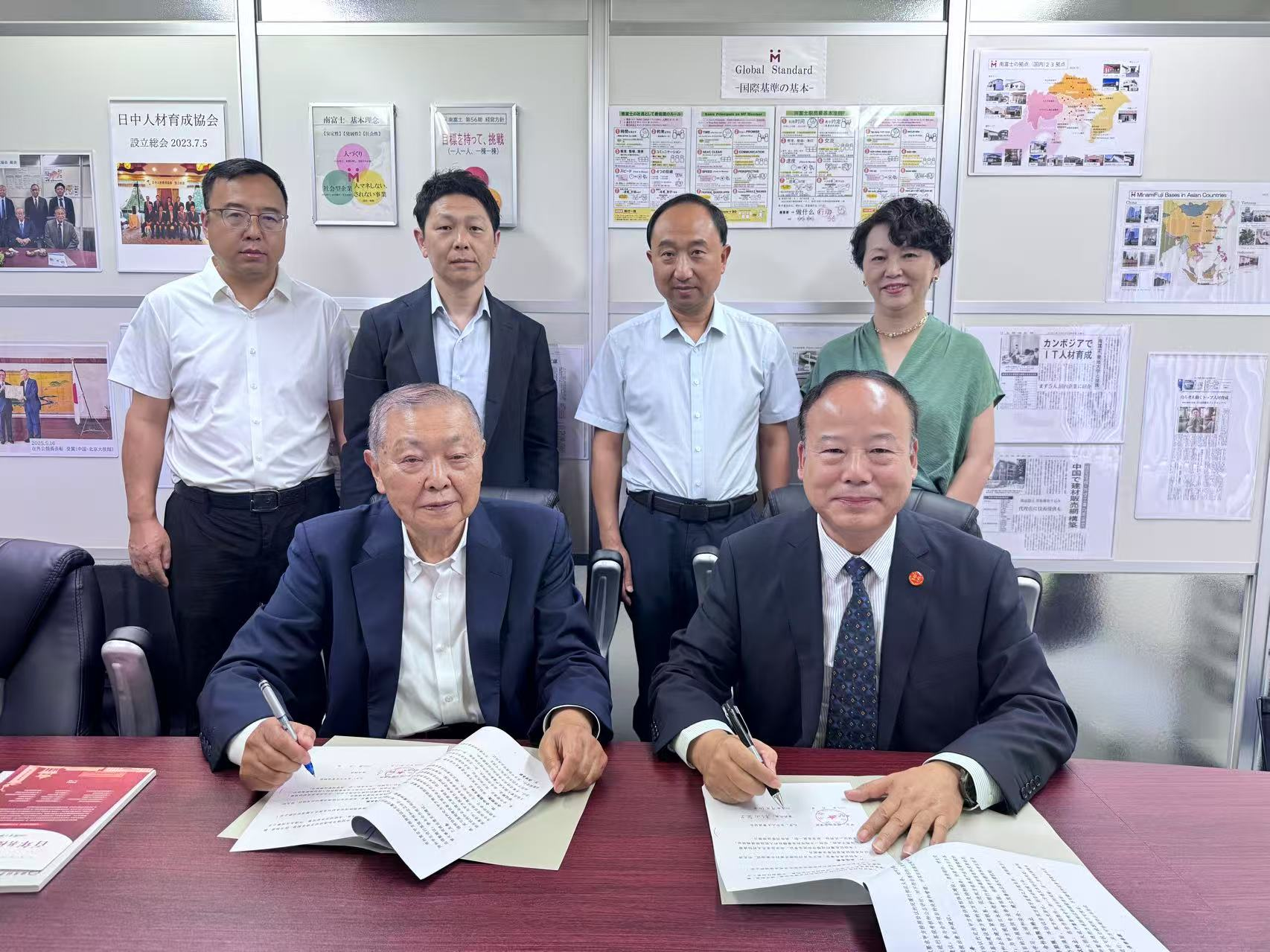 7月10日上午,副校长罗新远同陕西团领导汉中市民政局党组书记、局长苏智刚,陕西省旅居康养产业协会会长吴宁、西安丝路类脑科学研究院董事长吴恒莉等到东京市日中人才育成协会访问交流。双方就康养产业、人工智能、管理人才培养等方面的合作开展了务实交流,并签订了合作框架协议。日中人才育成协会理事长、南富士株式会社会长杉山定久,日中人才育成协会理事、南富士株式会社社长杉山拓等陪同交流并签署协议。