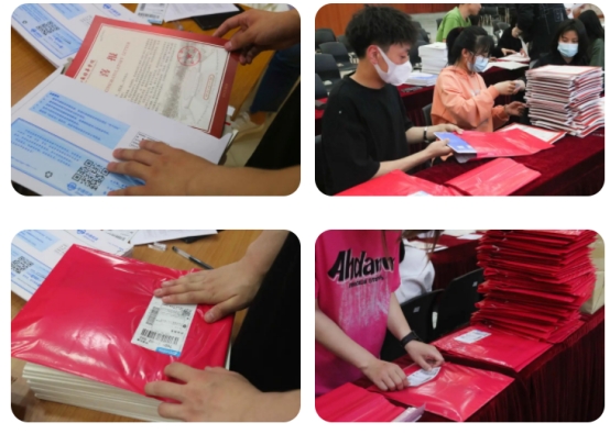 一份份喜报,都代表着认可与激励,一个个红印章,都是来自老师们的祝福。经过认证核对信息、小心分装,一份份载满荣誉的邮件,飞过大江南北,飞向每一位翘首以盼的家长的手中。