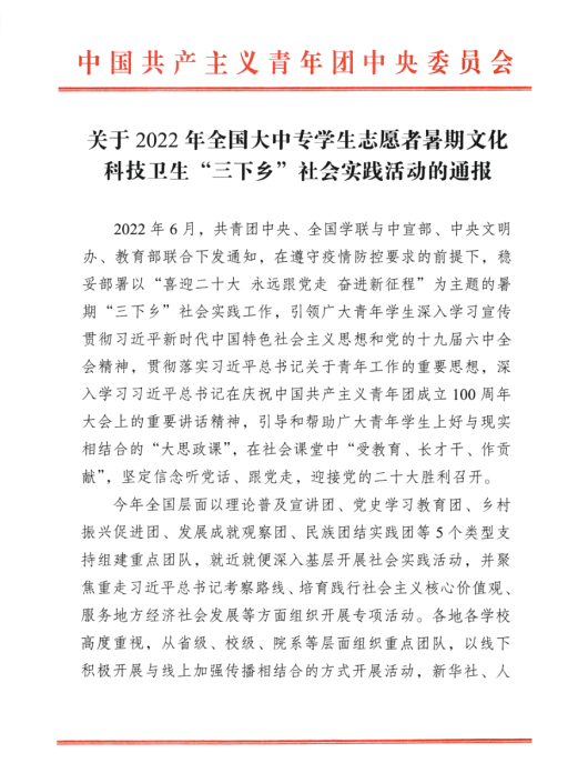 为深入总结交流经验、选树典型宣传,推动引领示范、激励广泛参与、发挥育人实效,引导和帮助广大青年学生上好与实际相结合的“大思政课”,在社会课堂中“受教育、长才干,作贡献”,坚定信念听党话、跟党走,迎接党的二十大胜利召开,共青团中央青年发展部决定对在2021年度社会实践活动中表现突出的集体、个人和项目开展总结通报工作。学校团委荣获“2022年全国大中专学生志愿者暑期‘三下乡’社会实践活动优秀单位”称号。