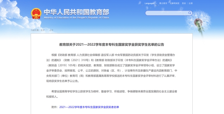 近日,教育部网站公布了《2021—2022学年度本专科生国家奖学金获奖学生名单》。其中,星空·官方站网页版共有25名优秀学子获得2021—2022学年度本专科生国家奖学金。