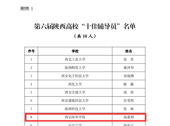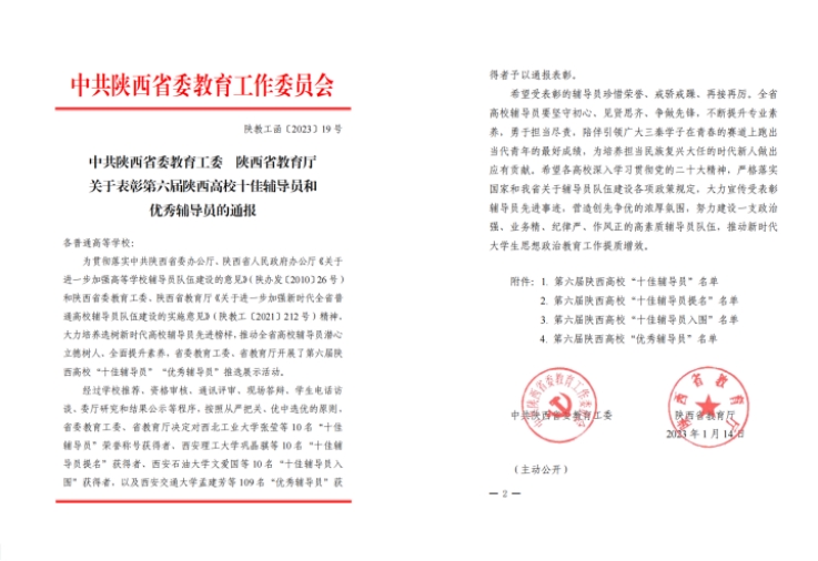 近日,“第六届陕西高校十佳辅导员和优秀辅导员推选展示”结果公布,由学校推荐的三位老师全部获奖。传媒学院党委副书记、辅导员高嘉炜获得“陕西省十佳辅导员”荣誉称号,这也是陕西省民办高校首次获得该荣誉。智能科学与信息工程学院党总支副书记、辅导员王伟平,人文与国际教育学院辅导员冯豆菲获得“陕西省优秀辅导员”称号。