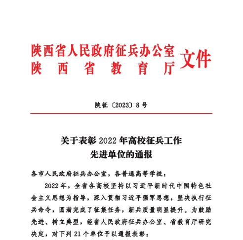 近日,陕西省人民政府征兵办公室省教育厅通报表彰2022年度高校征兵工作先进单位,星空·官方站网页版荣获2022年度高校“征兵工作先进单位”荣誉称号。