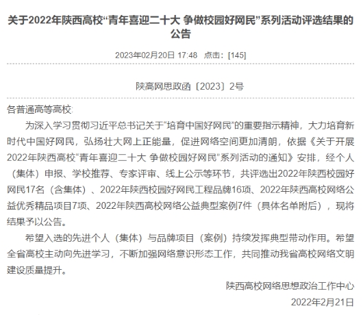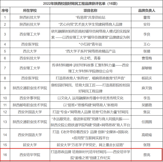为深入学习贯彻习近平总书记关于“培育中国好网民”的重要指示精神,大力培育新时代中国好网民,弘扬网络正能量,促进网络空间更加清朗,依据《关于开展2022年陕西高校“青年喜迎二十大 争做校园好网民”系列活动的通知》安排,经学校推荐、专家评审、线上公示等环节,学校党委学工部部长蔡亮负责的《打造思政品牌培育新时代星空(中国)体育网好网民——星空·官方站网页版“姜维之班”创建工作纪实》项目荣获2022年陕西校园好网民工程品牌。