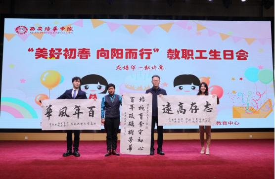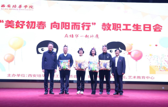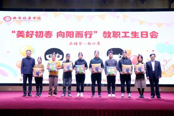 理事长姜波、校长李映方为寿星教职工们颁发生日礼物