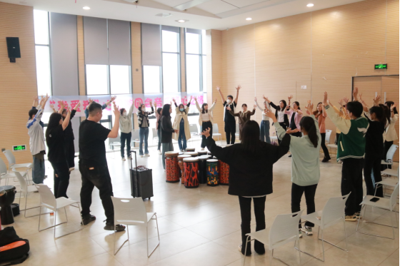 ——举办音乐疗愈表达性艺术心理体验活动。音乐疗法是通过特定的活动设计和音乐体验来消除心理障碍,缓解焦虑和抑郁的情绪,从而达到调整身心平衡的作用。在两位音乐治疗老师的带领下,一场活力动感的非洲鼓音乐团辅以轻松、自由、动感的律动和节奏,通过舞蹈、游戏、敲鼓,帮助同学们放松心情、释放情绪、卸下心理包袱,关爱自我,提高身心素质。在活动的最后,参与者各自用一个词语表达了本次活动的收获和感受:开心、放松、感恩、平静、欣慰……