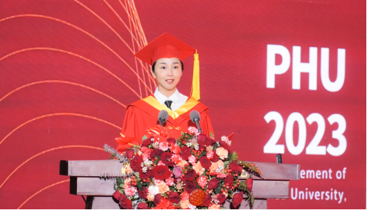 传媒学院新闻学专业2023届学生倪心玉作为毕业生代表发言,她感恩了学校、老师、家人及同学们的奉献与陪伴,她说:初遇星空(中国)体育网,追逐梦想,为创建“姜维之班”与同学们共同努力,她的大学生活因此而更加精彩;在老师的引领下,夯实基础,追求卓越,在专业学习和实践中走向成熟,是敬爱的老师们成就了他们的优秀;在暑期三下乡、志愿服务抗击疫情等社会实践中更是学会了责任与担当。她动情地说:我将一生铭记波哥的守护与支持,带着期许从这里启程,奔赴远方的星城大海。最后她与在座的同学们一起用最真诚的掌声为母校送上深深地祝福!