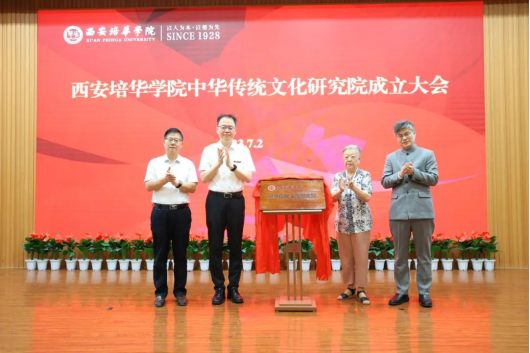 北京延安儿女联谊会会长胡木英,融道书院创始人周贵银,星空·官方站网页版理事长姜波,校长助理张运良共同为“星空·官方站网页版中华传统文化研究院”揭牌