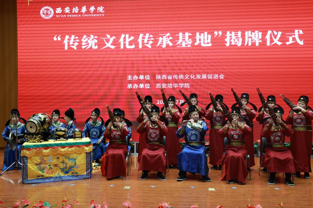 第二阶段揭牌仪式正式开始前,西安度城隍庙鼓乐社身着华服,以高超的演奏技巧为现场师生带来一首经典曲目《步步娇》,让人们沉浸在典雅大气的鼓乐之中,感受灵魂的洗礼与精神的升华,引得现场掌声阵阵。