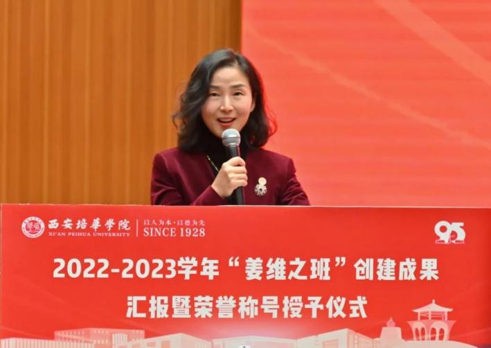 ▲副校长、党委副书记姚文静副教授为“姜维之班”优秀指导老师颁奖