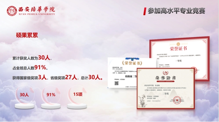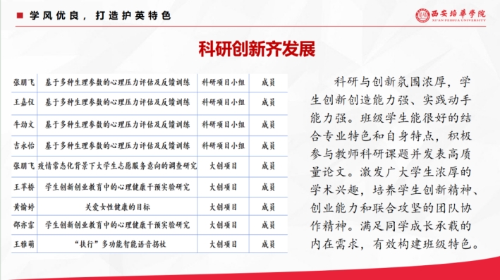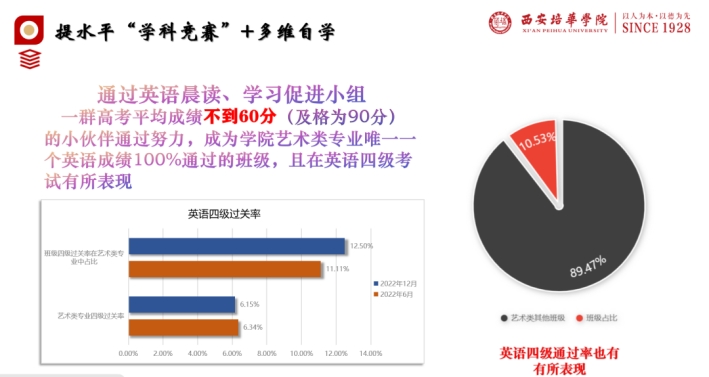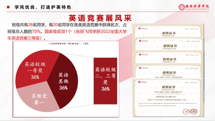 人文与国际教育学院英语2104班坚持“党—团—班”一体化机制建设,一个思想、三向同归、一个指导、四个建设,创建过程中,全班普通话水平考试通过率100%,英语四级通过率97%。科研竞赛中荣获国际级项目2项,省级项目4项,校级项目6项;其余荣誉国家级19项,省级6项,校级25项。在创建中成长,在创建中奋进,做讲好中国故事的践行者、讲述者、传播者。