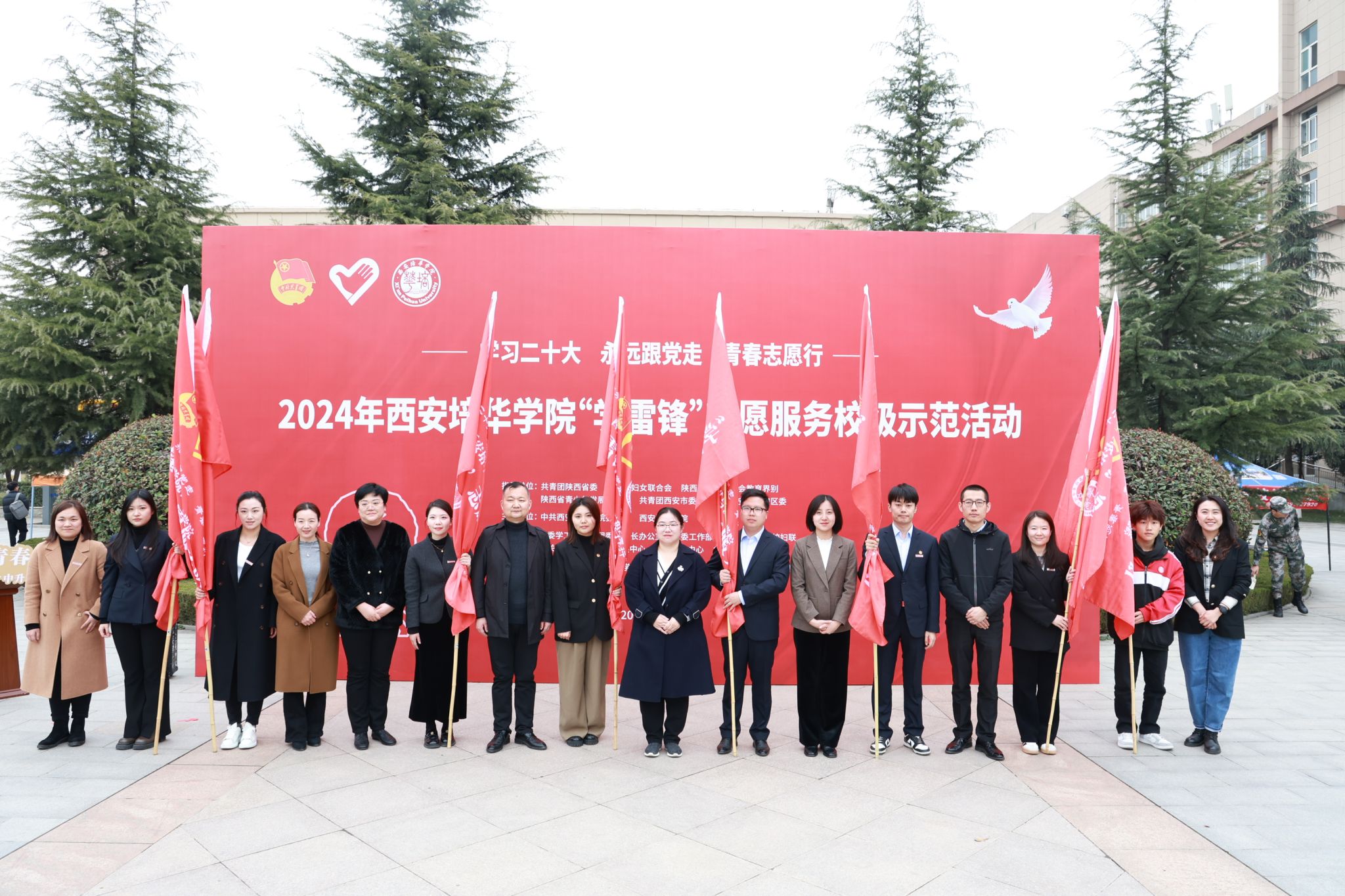 贾卫周调研员、尤婷副书记、赵娟主任、胡若楠副书记、张小娟主任、鲜永昌老师、韩赟主任、杨媛副部长为二级学院“学雷锋”志愿服务分队授旗