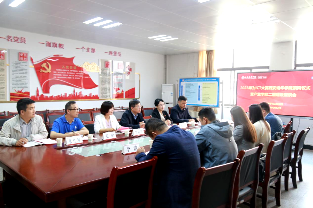 为表彰在2023年华为ICT大赛中表现优异的学生团队,进一步深化产教融合、推进鲲鹏信创产业学院二期建设,4月12日,学校智能科学与工程学院举办2023华为ICT大赛颁奖仪式暨产业学院二期建设座谈会。华为技术有限公司陕西创新发展中心教育行业经理苏珂,华为云陕西鲲鹏生态创新发展中心运营经理孙琦,深圳市讯方技术股份有限公司陕西教育业务代表王姗姗、北部片区产品经理王小龙、高校客户经理李浩及学院领导和教师代表出席会议。会议由智能科学与工程学院副院长毛莉君主持。