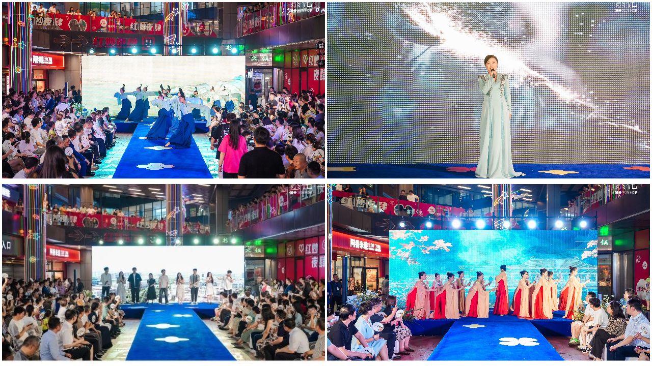 开幕式现场,同学们带来了舞蹈《只此青绿》《花想容》,歌曲联唱更是点燃了现场的激情,观众们纷纷挥手合唱,精彩的文艺表演以及服装动态展演将开幕式氛围拉向高潮。服装动态展演还有10名来自传媒与设计学院教工子女组成的小模特,他们身穿传统服饰自信地展示华服之美,吸引众多观众驻足欣赏。