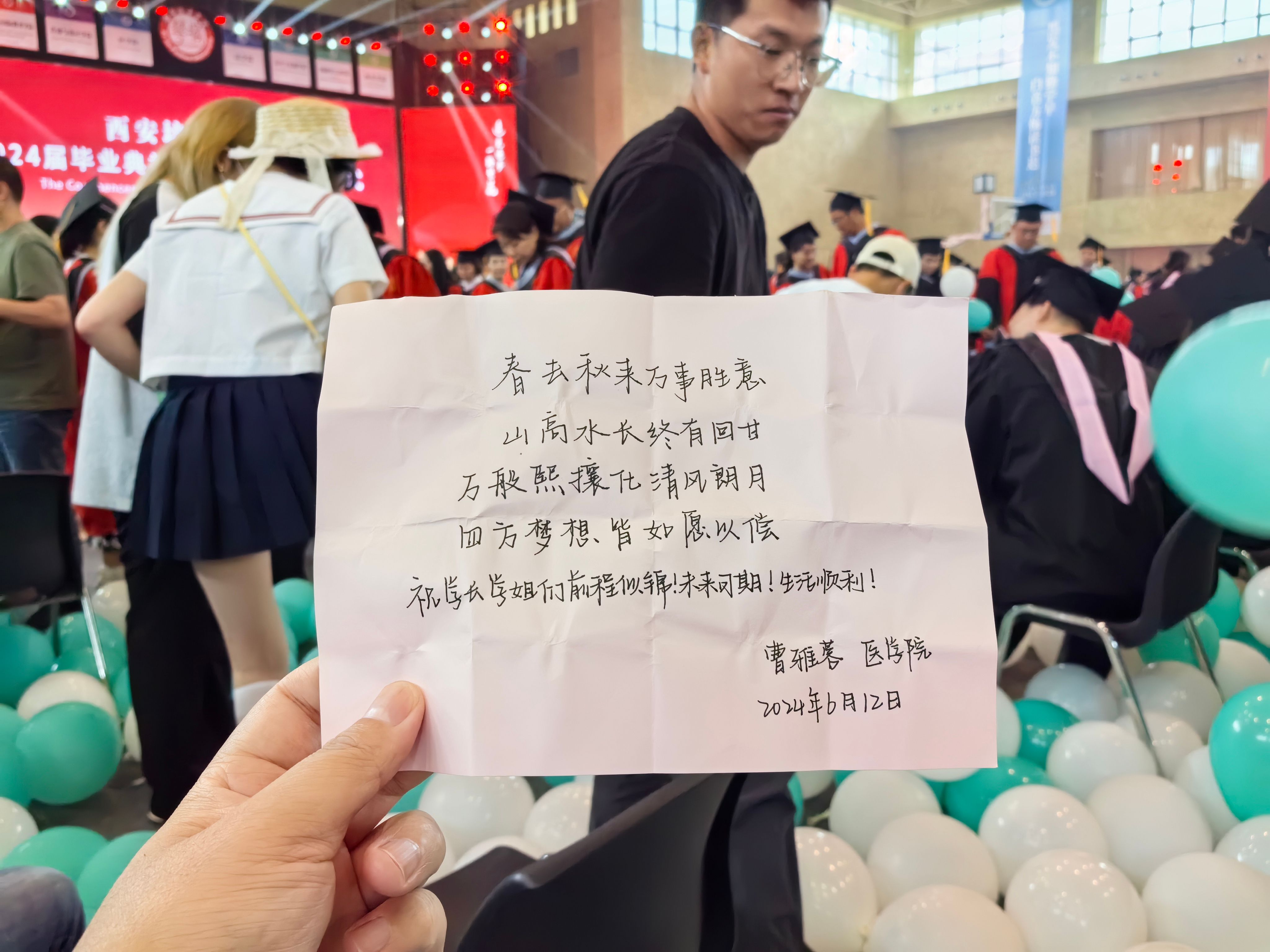 伴随着从空中飘下的彩色气球,一曲《送别》为大学时光画上句号。1928个气球里藏有1928封学弟学妹的手写信,毕业生将带着他们的祝愿勇往直前。