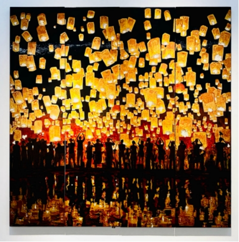 现代漆画,源于传统漆器工艺,将漆器髹饰工艺与当代绘画语言融通共构,让传统漆画创作的装饰美、工艺美、材料美与当代艺术绘画性、塑造力、抽象美有机融合,在媒介技法上传承中华漆艺传统技艺。自第十二届全国美展正式设漆画为独立展区以来,漆画创作队伍不断壮大。本次入选的一组作品《祈望》借助漆艺的彩绘、渲染、堆塑等手段,让整体和谐统一,既追求艺术形式,又重视内涵意蕴,使其在意境营造、品质格调和形式语言等方面都达到了较高的艺术水平。同时,作者通过漆画中的万千灯火点亮心中赤诚的爱,祝福伟大祖国繁荣昌盛!