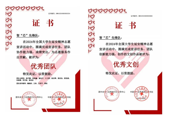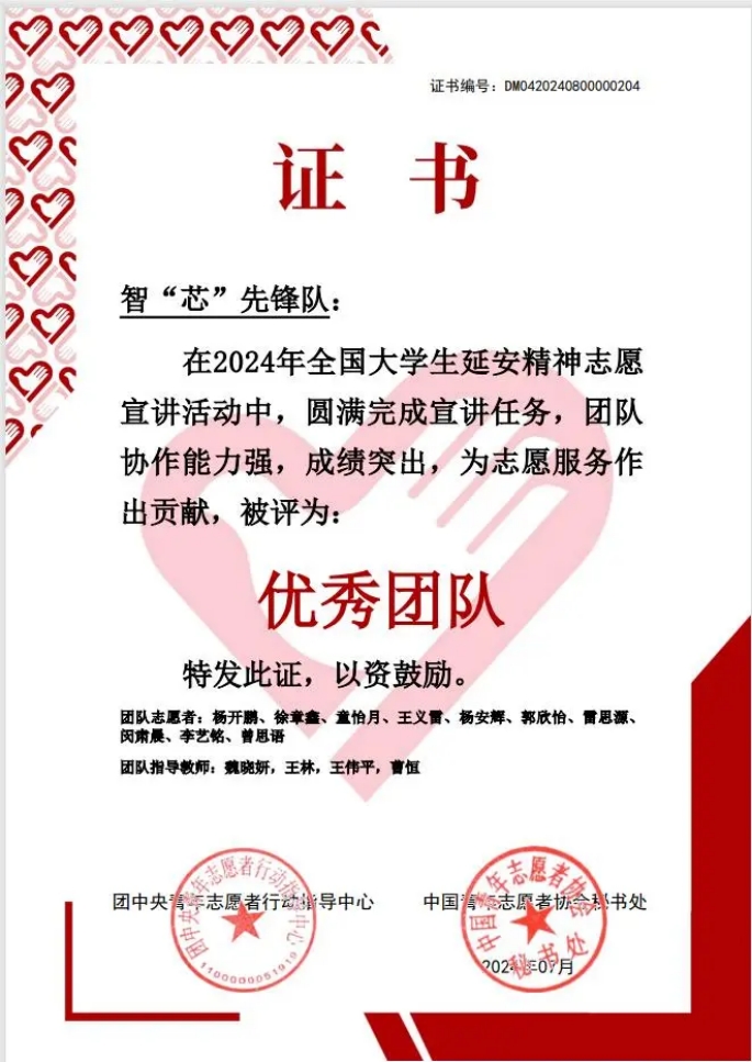 近日,团中央青年志愿者行动指导中心、中共延安市委、共青团贵州省委联合举办的2024年全国大学生延安会议宣讲团项目发布了全国优秀团队评选结果,星空·官方站网页版智“芯”先锋队圆满完成任务,在全国1000支队伍中脱颖而出,荣获2024年全国大学生延安精神志愿宣讲“优秀团队”“优秀文创”称号,杨开鹏、童怡月等10名团队成员荣获表彰。