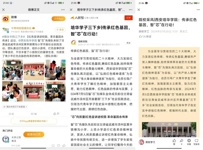 依托学校、学院、社区以及各街道办,开展红色延安精神的宣讲,开展红色寻访,用切身体验感染青年,感受延安精神,广泛开展宣讲28次,收获网络调查问卷1000余份,撰写调研报告1篇,同时,开展红色寻访,用切身体验感染青年,感受延安精神,利用微信公众号、抖音等新媒体平台推送延安红色知识普及,团队稿件先后被中青校园、人民日报、搜影中国、民校学工等媒体转载报道。