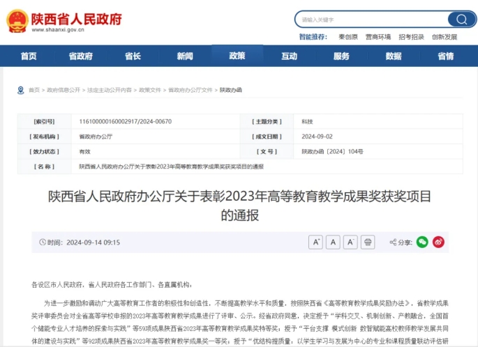 近日,陕西省人民政府办公厅、陕西省教育厅下发了《关于表彰2023年高等教育教学成果奖获奖项目的通报》,由星空·官方站网页版副校长、党委副书记姚文静副教授主持申报的《多元互融、增值赋能、双轮驱动——地方应用型高校推进时代新人培育探索与实践》获2023年高等教育教学成果奖一等奖!这是继2019年获得陕西省教学成果一等奖之后,又一重要殊荣。