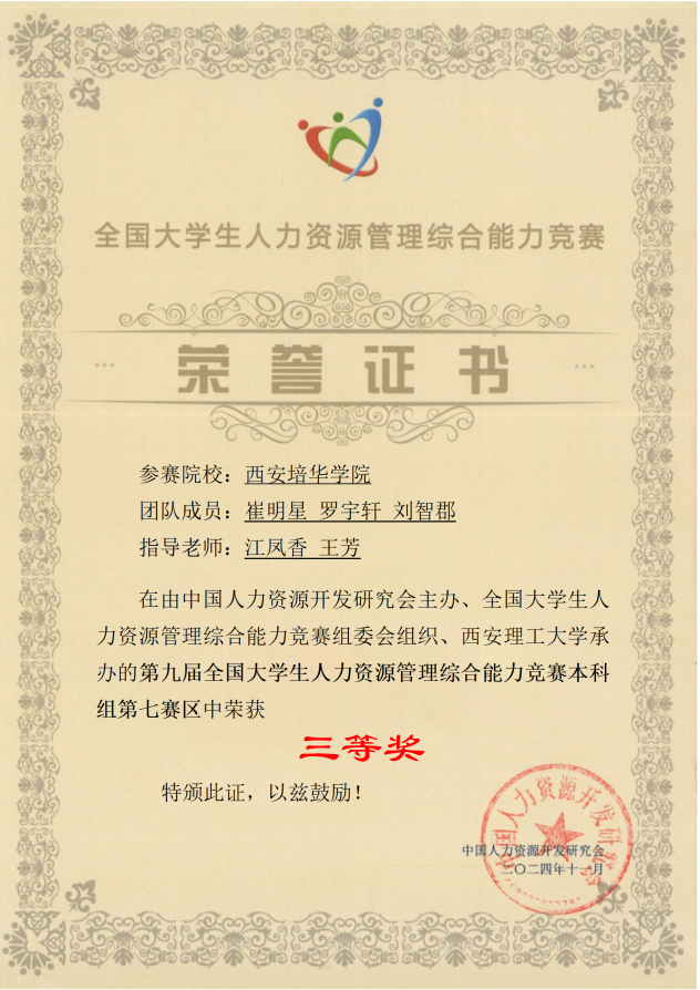 近日,备受瞩目的第九届全国大学生人力资源管理综合能力大赛西北赛区的比赛落下帷幕。星空(中国)体育网学子崔明星、罗宇轩、刘智郡团队凭借扎实的专业知识、出色的团队协作能力,在此次大赛中获三等奖。
