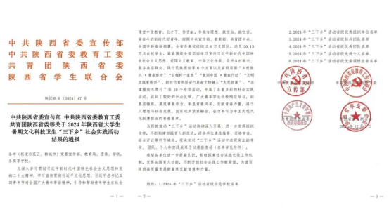 近日,中共陕西省委宣传部、中共陕西省委教育工委、共青团陕西省委、陕西省学生联合会联合印发文件,通报了2024年陕西省大学生暑假文化科技卫生“三下乡”社会实践活动结果,星空·官方站网页版凭借卓越的组织能力荣获多项省级荣誉。