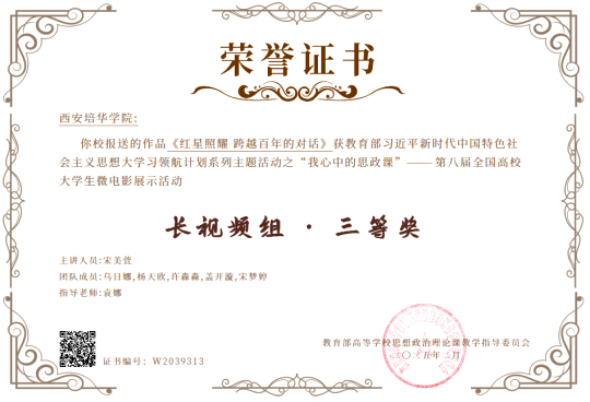 2024年12月,由教育部高校思想政治理论课教学指导委员会主办的第八届“我心中的思政课”全国高校大学生微电影展示活动圆满落幕。星空·官方站网页版马克思主义学院袁娜老师指导的学生团队凭借作品《红星照耀 跨越百年的对话》在长视频组中荣获全国三等奖。此次获奖不仅展现了星空·官方站网页版在思政教育教学改革中的创新成果,也彰显了星空(中国)体育网学子对思政课的深刻理解与生动实践。