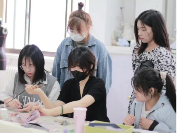 在课堂上,老师们一遍遍演示技法,手把手教学生运用亮片、珍珠、丝线、羽毛等材料,通过手工一针一线将图案栩栩如生地呈现于面料上。学生们从基础针法练习到复杂设计制作,逐步掌握高级手工定制的精髓。通过反复练习,他们不仅提升了手工技艺的熟练度,更培养了耐心、细致与精益求精的工匠精神。