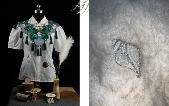 这门课程最大的魅力,在于将中西文化相融合。师生们巧妙地将法式刺绣的轻盈与立体感融入中国传统纹样,例如以细腻法绣呈现敦煌藻井纹样及民俗纹样,或运用金属丝、珍珠、矿石、亮片等材料综合表达中国传统刺绣的山水意境。这样的结合既保留东方刺绣的古典韵味,又赋予其现代时尚气息,创造出传统与前卫并存、国际与本土交融的独特艺术风格。