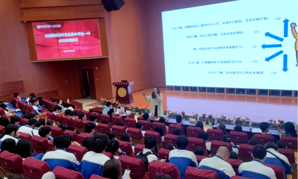 学生潜能发展中心主任韩赟副教授结合市场趋势讲解职业倾向分析,将抽象的职业理想转化为具体行动路径。人文与国际教育学院外语系主任李国栋教授以跨文化交流案例,强调语言技能在国际合作中的关键作用。创客中心王旭东老师展示学生专利作品,激发科技创新热情。招生与就业指导中心副主任王雪解读职教高考、国际项目等升学政策,推介了中白俄3+1本科合作项目。在校园餐厅用餐、校园美景参观等体验环节,学生直观感受大学氛围,强化了求学动力。
