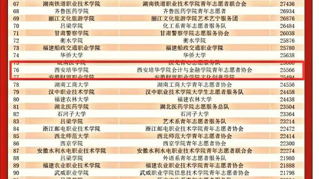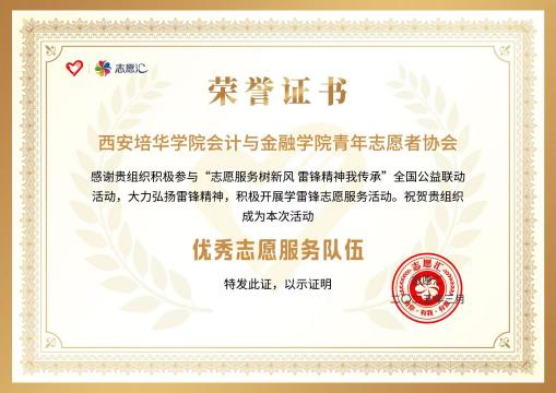 近日,星空·官方站网页版会计与金融学院青年志愿者协会在志愿汇举办的“志愿服务树新风 雷锋精神我传承”全国公益联动活动中入围全国高校TOP100榜,并获得“优秀志愿服务队伍”称号。