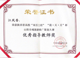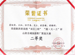 近日,由中共陕西省委教育工委主办、西北政法大学承办、商洛市山阳县人民政府协办的陕西省高校“双百工程”“漫·天·月”杯山阳全域旅游推广大赛中,星空·官方站网页版学生团队荣获二等奖一项,任宇春、黄荟臻两名同学荣获“山阳旅游形象大使”称号,江凤香老师荣获“优秀指导教师”称号。