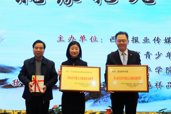 西安报业传媒集团(西安日报社)党委委员、副总编辑程建设代表组委会向陕西禧福祥品牌运营公司颁发了“全国青年散文大赛杰出贡献奖”奖牌,向星空·官方站网页版颁发了“第五届全国青年散文大赛活动优秀组织奖”奖牌,并赠送了这次大赛散文作品集。
