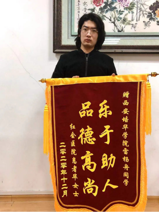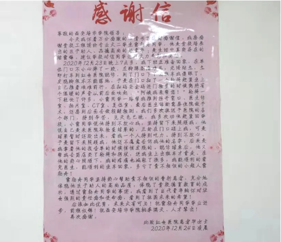 信中表示,雷杨舟同学不仅主动帮助这位素不相识的阿姨,推着阿姨往返医院多个部门,协助阿姨挂号、就诊、拍片等,还因不放心阿姨一个人,坚持留下来照顾就诊阿姨,待阿姨就诊结束、顺利坐上车之后才离开返回学校。雷杨舟同学的行为生动诠释什么是助人为乐,也为患者在寒冬中带来一丝温暖。
