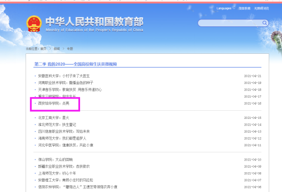 在省委教育工委组织开展的“我的2020-全省高校师生扶贫微视频征集” 活动中,学校报送的扶贫微视频《点亮》脱颖而出,在教育部专题网站展示。