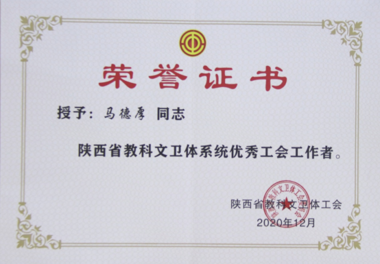 马德厚被评为“陕西省教科文卫体系统优秀工会工作者”