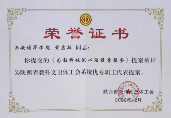《为教师提供心理健康服务》提案被评为“陕西省教科文卫体系统优秀提案”