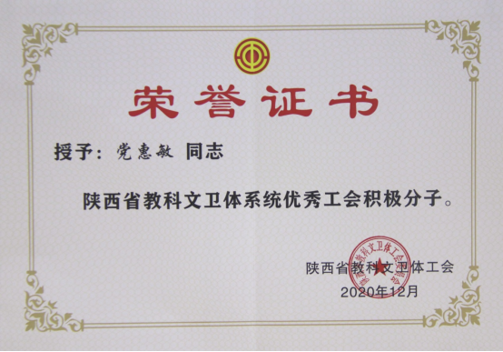 党惠敏被评为“陕西省教科文卫体系统优秀工会积极分子”