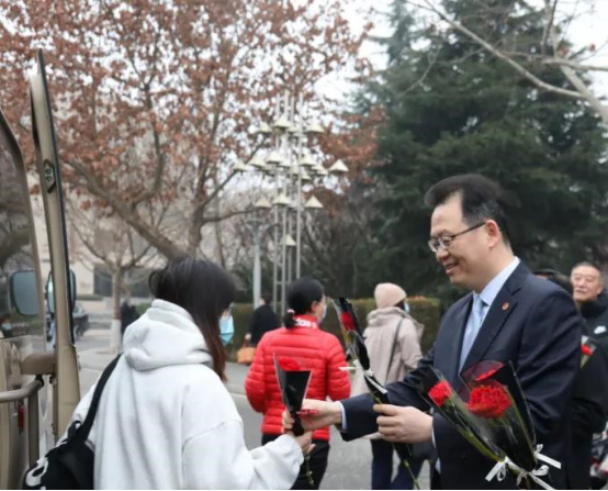 三八女神节当日清晨姜波理事长带领学校领导班子为女教职工送上节日祝福