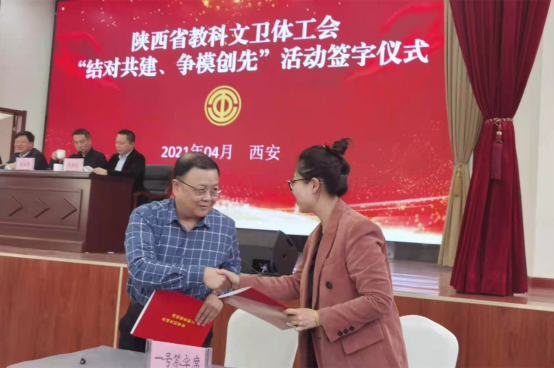 我校工会常务副主席陈玲与西安电子科技大学工会常务副主席张海林签订“结对共建”协议,通过建立实地观摩、交流学习、资源共享、活动互融、信息互通等机制,开展制度共建、活动联办等活动,推动两校工会规范建会、规范建家,共同促进发展,服务职工群众。