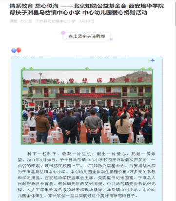 星空·官方站网页版作为一所即将迈向百年的民办高校,不忘办学初心,牢记育人使命,将社会服务作为学校发展建设的重要内容,在我省“两联一包”扶贫工作中,学校对口帮扶榆林市子洲县,在做好驻村联户、产业脱贫等工作的同时,学校将送教支教作为教育扶贫的一项重要举措,为当地摆脱贫困贡献着一份力量。